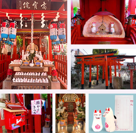 神社の境内には高宝院稲荷のお社があります。お稲荷さんは稲、食物の神様でありましたが、現代では産業全般、商売繁盛の神様として崇められています。稲荷神をお守りしているのがきつねさん。